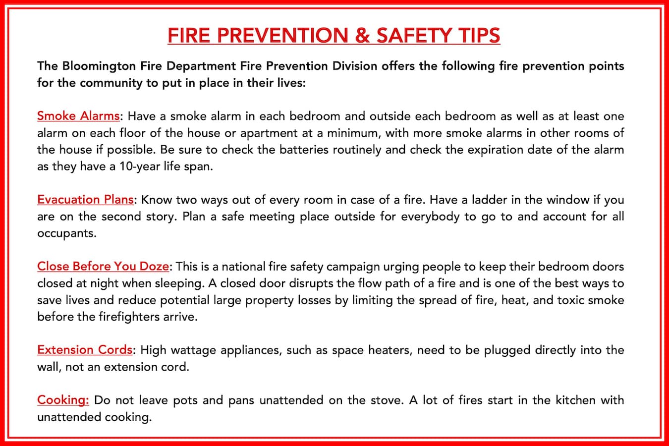 The Bloomington Fire Department’s four-member Fire Prevention Division works year-round to reduce the risk of fires in the city. Along with the rest of the fire department, they promote fire safety efforts through education, engineering controls, and enforcement.