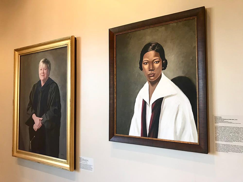 A portrait (right) of Frances Marshall hangs in the Women of Indiana University collection in the IMU’s East Lounge, next to one of Angela Barron McBride, a dean and distinguished professor in the School of Nursing. Marshall was the first African American female to graduate from Indiana University (1919). | Photo by Samuel Welsch Sveen