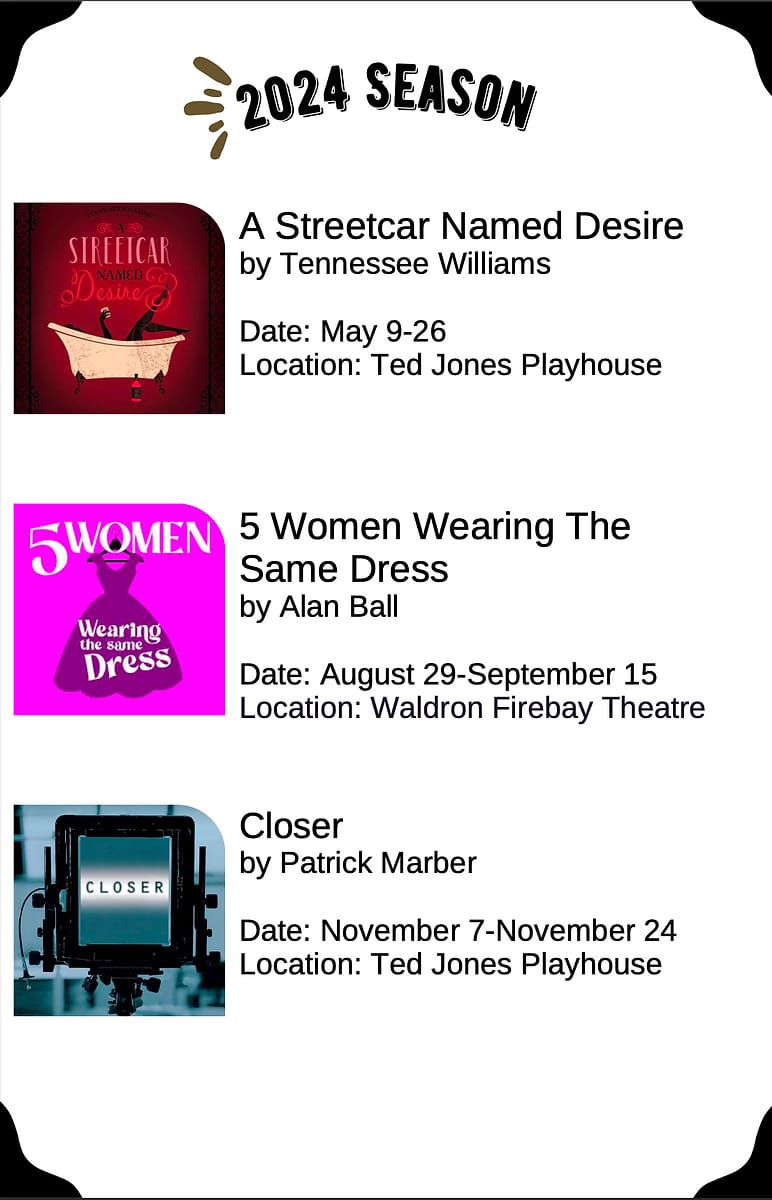 A Streetcar Named Desire will run May 9–26, 2024, at Ted Jones Playhouse, 107 W. 9th St., Bloomington. Performance times are 7:30–9:30 p.m. (EST). Tickets are $10–$25 with a “pay-what-you-will” option (above $10) plus a service fee for Thursday shows (May 9, 16, and 23). For ticket information, visit Eclipse Productions Company, Buy Tickets.