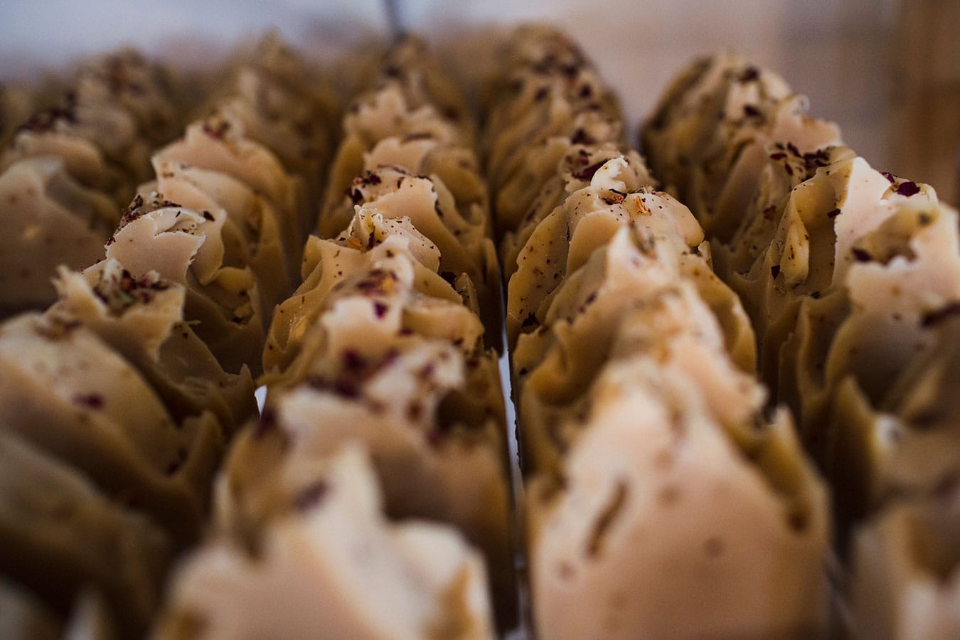 An array of “Hustle Rose” goat milk soap sits on the shelf at Barnhouse Farms’ soap workshop, right outside of their home. Chelssie has been soap making for nearly four years, and they are entering their third season at the market. The botanical bits on top of the soap are grown organically by the farm — even the coloring comes from their own produce, like carrots and spinach.