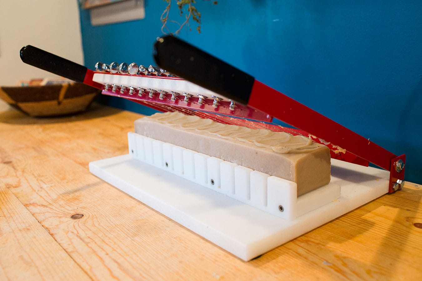A soap cutter, made with guitar strings, is seen on the workshop’s counter. Sean makes soap molds out of raw pine; one batch makes 14 bars of soap. Soap-making supplies include essential oils, botanicals like mint and red clover, and frozen purées and goat milk. “Goat’s milk will burn as you make (the soap) if you don’t freeze the cubes first,” Chelssie says.