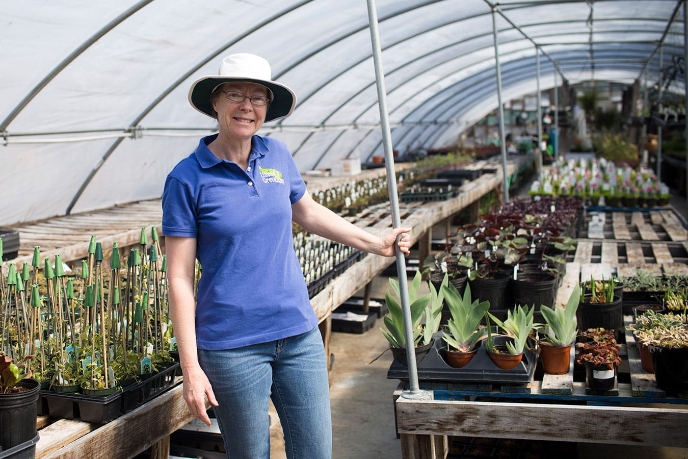 Linnea Good poses in her greenhouse in Unionville. Along with her husband, she runs Linnea’s Greenhouse, which specializes in herbs, vegetable plants, succulents, house plants, perennials, annuals, native ferns, and many tropical plants. They’ve been part of the Bloomington Community Farmers’ Market since 1996.