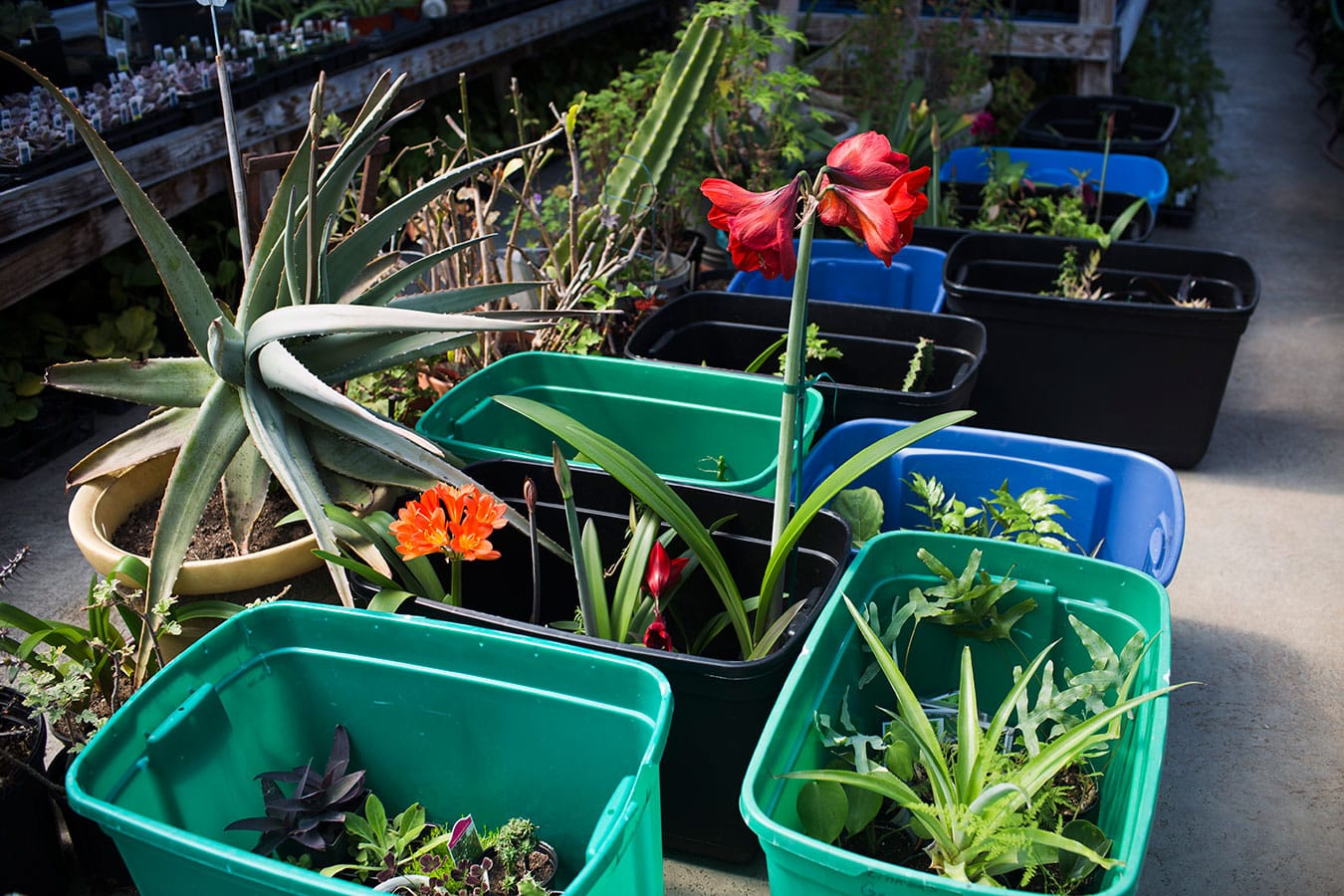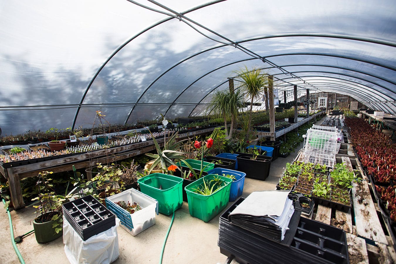 Trays of succulents line the floor of the greenhouse to stay warm. A nearby boiler, fueled by wood, pumps hot water underneath to heat the floor of the greenhouse in the winter. “As long as you can keep the plant root warm, the rest of the plant will survive,” Linnea says. She will eventually move plants from the ground to the tables for better sunlight.