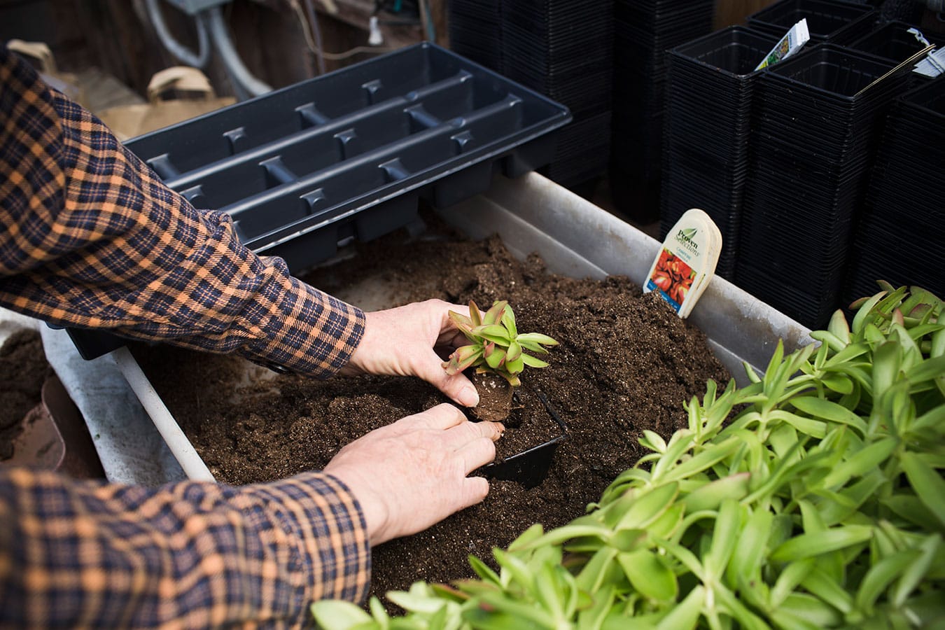 To prepare for the market, Linnea transplants a type of jade called Campfire in her greenhouse. “It’ll turn bright red in the cold. We are getting ready to transplant them,” Linnea says. To transplant, she pops them out of the original container, takes the paper off the soil, makes a hole in the soil of the new container, pops in the plant, and places soil on top. Then she labels them. “Nothing hard,” Linnea says. “As long as everything is right here you don’t have to move anything. I can stand here and crank them out.”