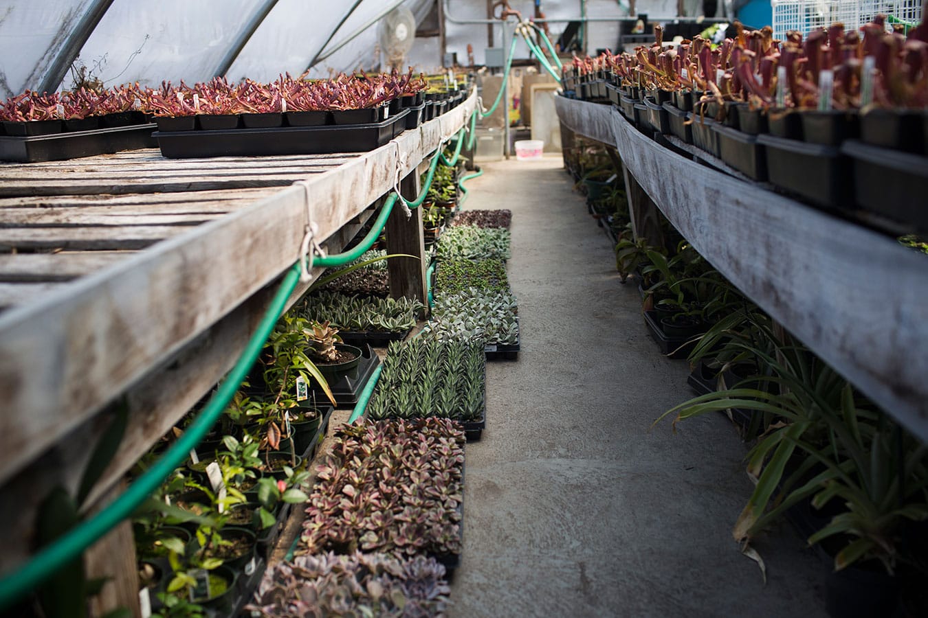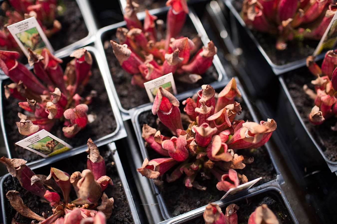 A type of carnivorous pitcher plant called Carolina Yellow Jacket soaks up some sun in the greenhouse. “I was actually feeding (the pitcher plants) the ants that are in my soil,” Linnea says. “Take a pair of tweezers, grab the ant, and put them wherever there’s an open mouth.” Like this pitcher plant, some plants have brown edges or turn red as a response to the cold, then they turn green when the weather warms up and they get more sunlight.