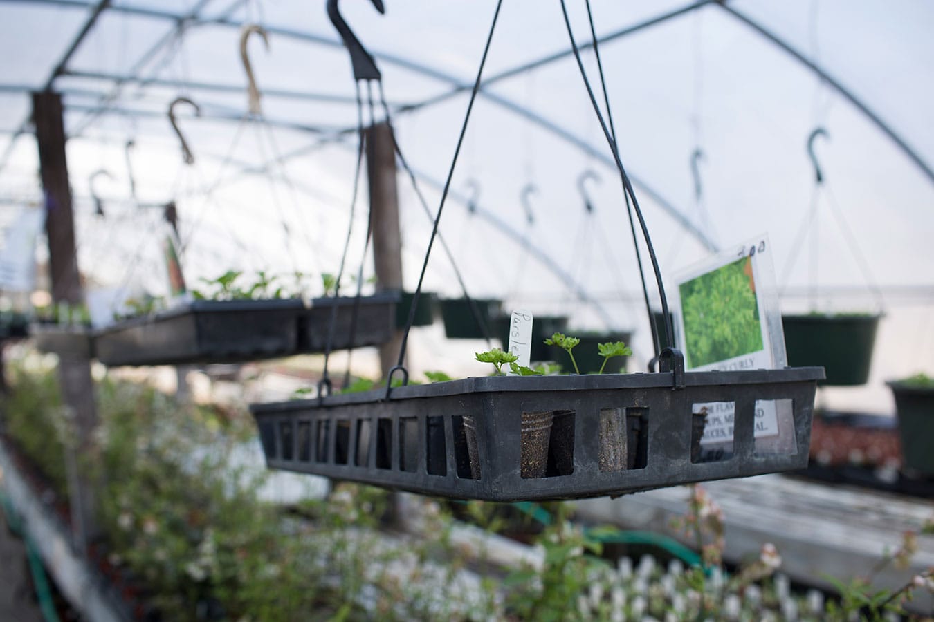 Parsley hangs in the greenhouse above the rest of the plants. Linnea hangs herbs and edibles to keep mice from eating them. “I hang things and it works,” she says. “It may look funny but it works.”