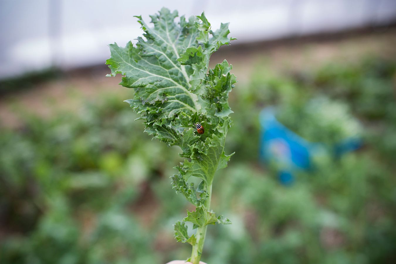 A ladybug crawls on a kale leaf inside one of the greenhouses. Since Living Roots is a chemical-free farm, insects like ladybugs provide the biological control — an environmentally friendly way to reduce pests through natural enemies. One of the more popular choices of this method, ladybugs (coccinellidae) consume aphids and other pests that would ruin the plants.