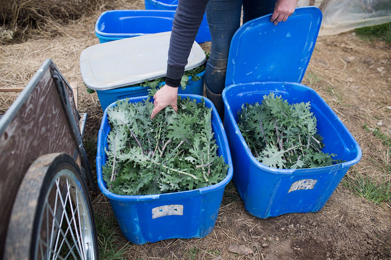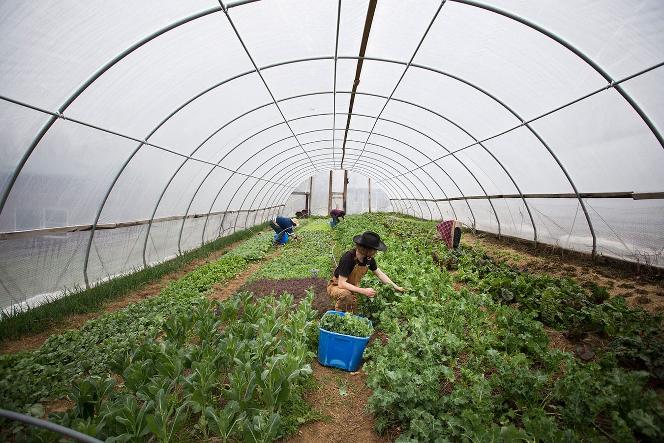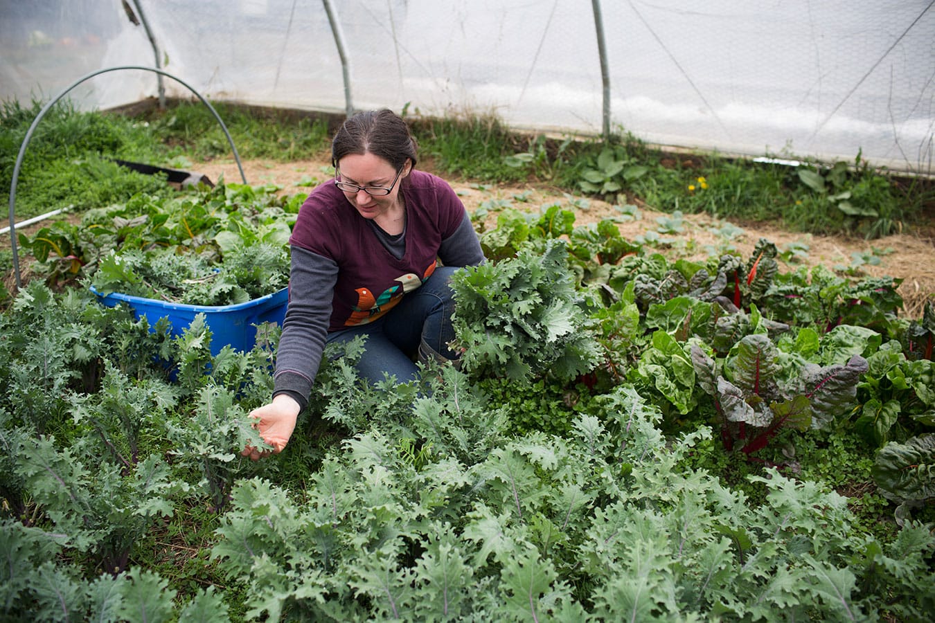 Farm worker Desiré Moore picks red Russian kale inside one of the greenhouses. During the winter, the farm planted 800 feet of mini tunnels. Spring crops normally wouldn’t be ready this early but can be when planted in tunnels. Michael says the first farmers’ market is an exciting time of year. “This year, especially, because the weather has not been great, sales have been lower for everyone, so hopefully it kind of gives a boost to the farmers’ market.”