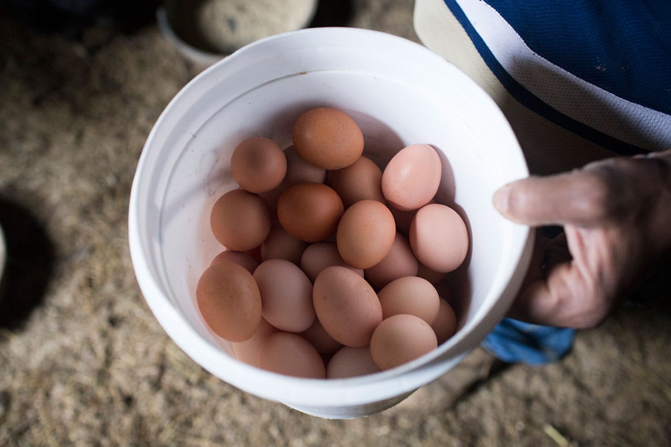 Farm worker Terrence Jackson shows the eggs he just picked in the chicken coop. They harvest about 70 eggs a day and that number can rise to 90 or 100. The farm also has goats and pigs.