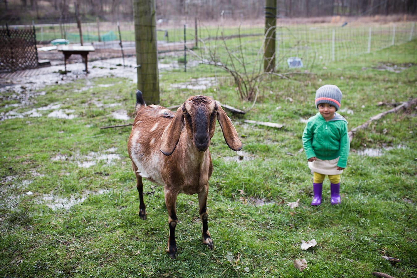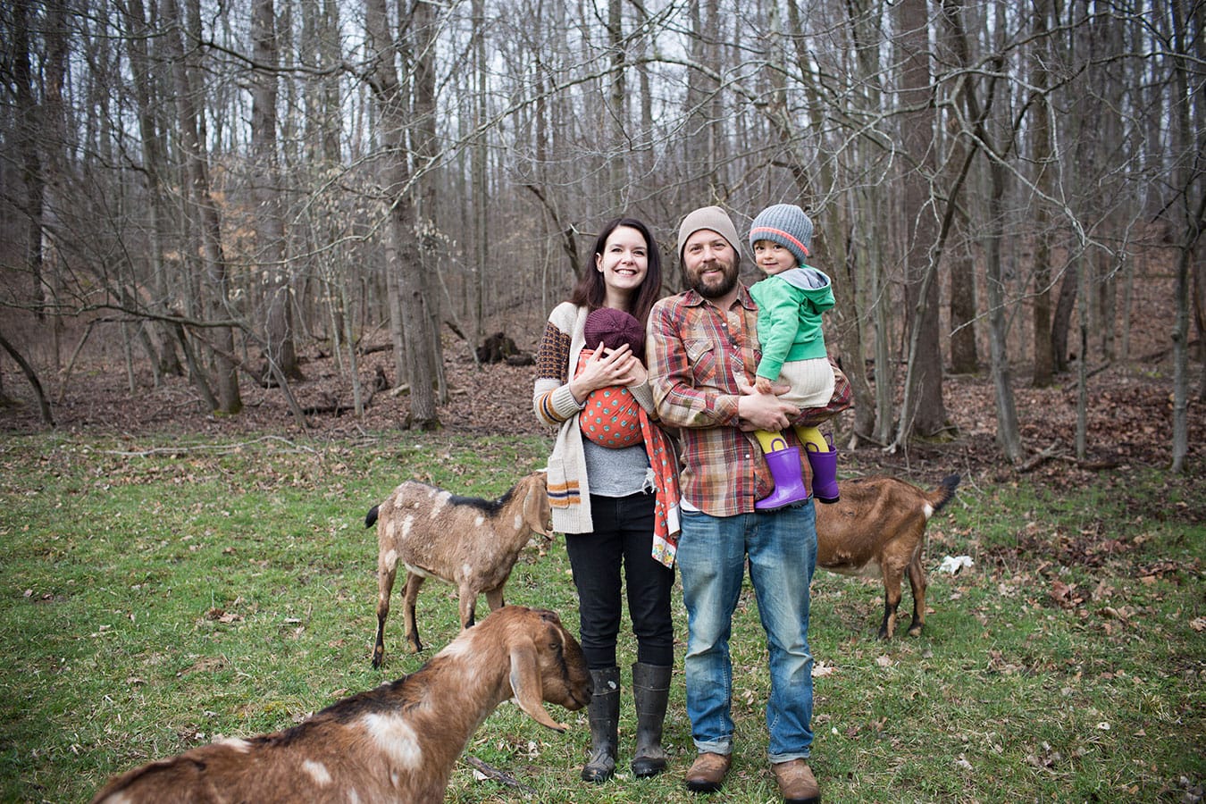 The McKinney family stands in a goat pasture at their home in Spencer, Indiana. Husband and wife team, Sean and Chelssie, run Barnhouse Farms, which specializes in goat milk soap, organic microgreens, and free-range eggs. They sell most of their goods at the Bloomington Community Farmers’ Market, and the rest supplies restaurants and stores.