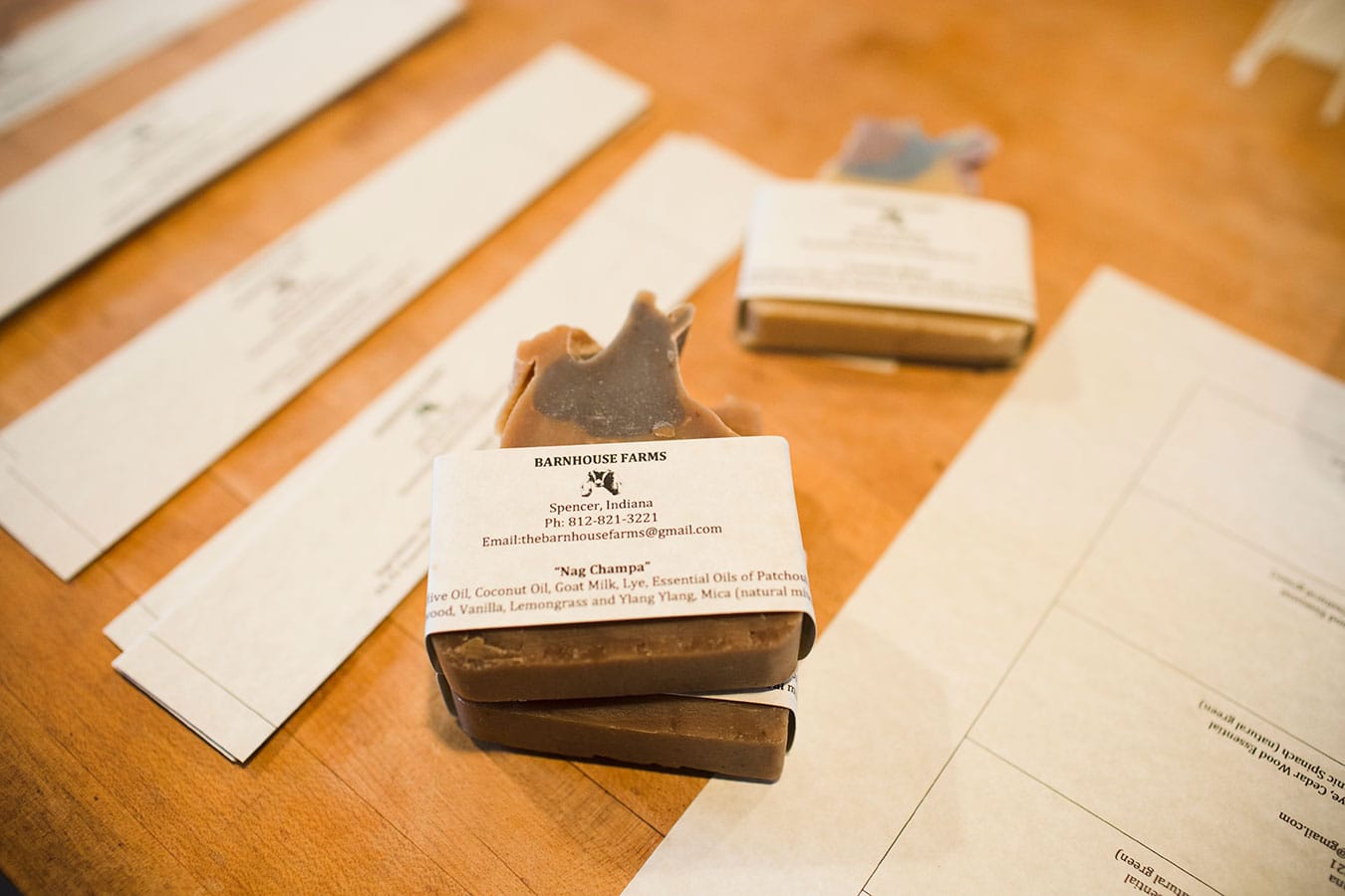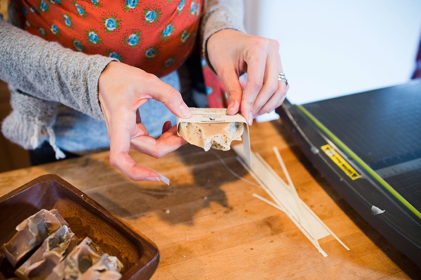 Chelssie labels the soap by hand in her workshop. “The one awesome thing about labeling everything by hand — nothing gets past you; there’s more attention to quality,” says Chelssie. To show off the design of the soap, the recycled paper she uses for the labels wraps around only the bottom part of the soap.