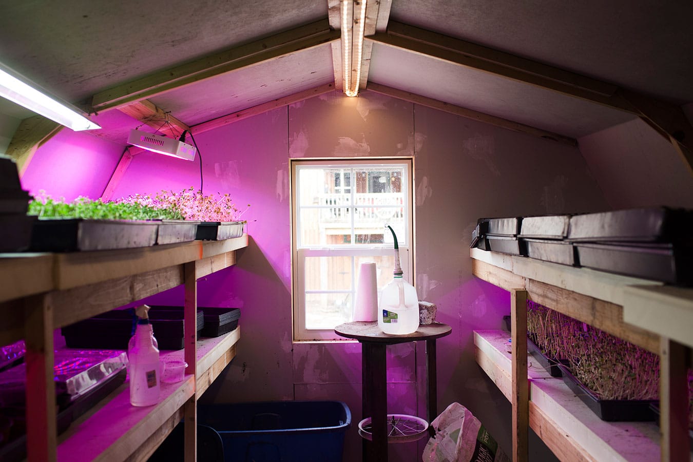 Trays of microgreens line the upstairs of the soap workshop. While Chelssie is the soap maker, Sean is the primary grower of microgreens and heirloom vegetables that they also sell at the farmers’ market. Because of the cold and uncooperative winter, they had to move the microgreens from their passive solar-powered and naturally lit sunroom into a new setup. They usually have about 70 trays of microgreens at once — a number that might double this year.
