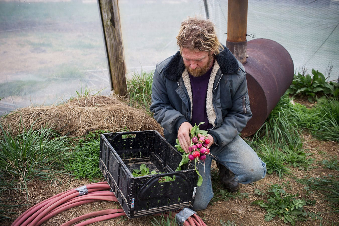 Michael Hicks, owner and founder of Living Roots Farm and Sustainable Living Center, looks over freshly picked radishes at his farm in French Lick. The farm has been with the outdoor Bloomington Community Farmers’ Market since 2005, selling vegetables, fruits, herbs and spices, free-range eggs, and grass-fed meats.