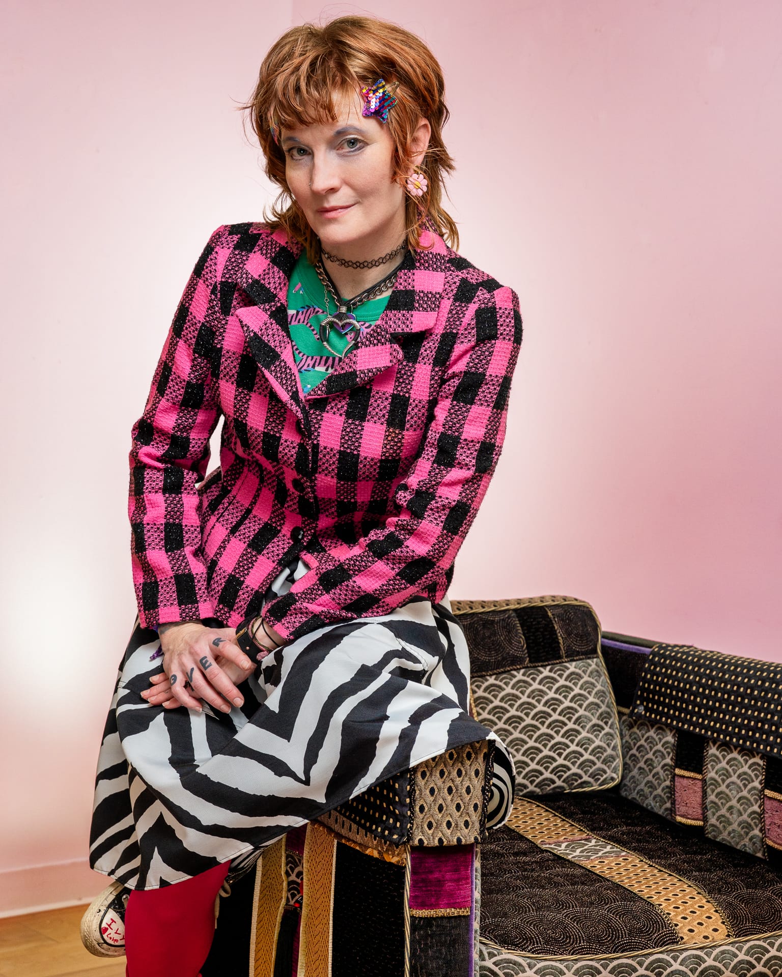 “I ride the waves of what feels like the power clash of the moment,” Conway muses. “Which stripes do I want to pair with which plaid turtlenecks and which lace do I want to sew onto this vest I’m making?”