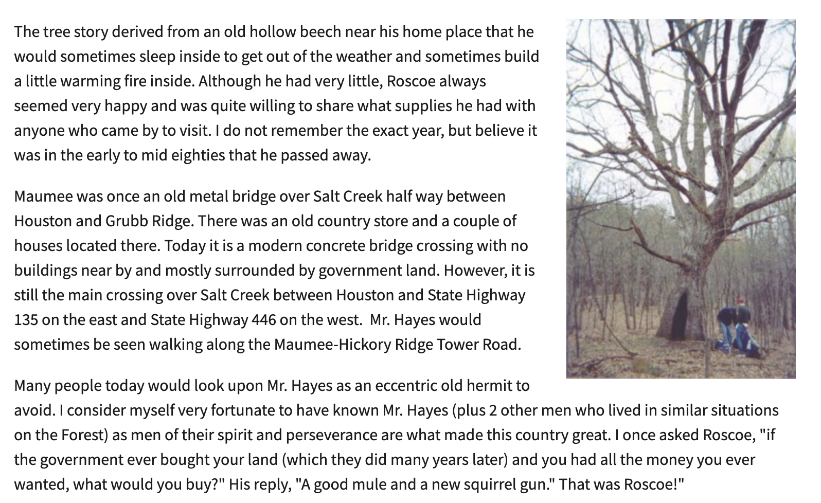When his cabin burned, Roscoe moved into a little shed, she says, but something happened to it. So, he found a big hollow beech tree, in which he built fires to keep warm and often slept to avoid the elements.